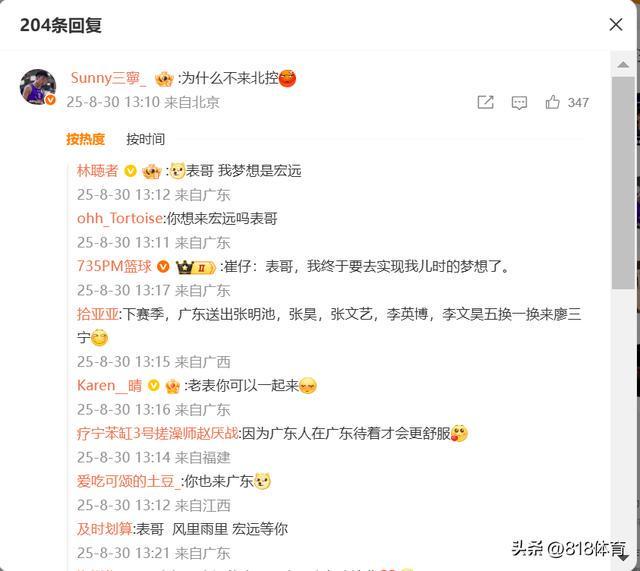 在崔永熙这条微博的评论区,目前效力于北控的表哥廖三宁现身评论区,并且以质问的口吻打趣写道:“为什么不来北控(生气表情包)!”