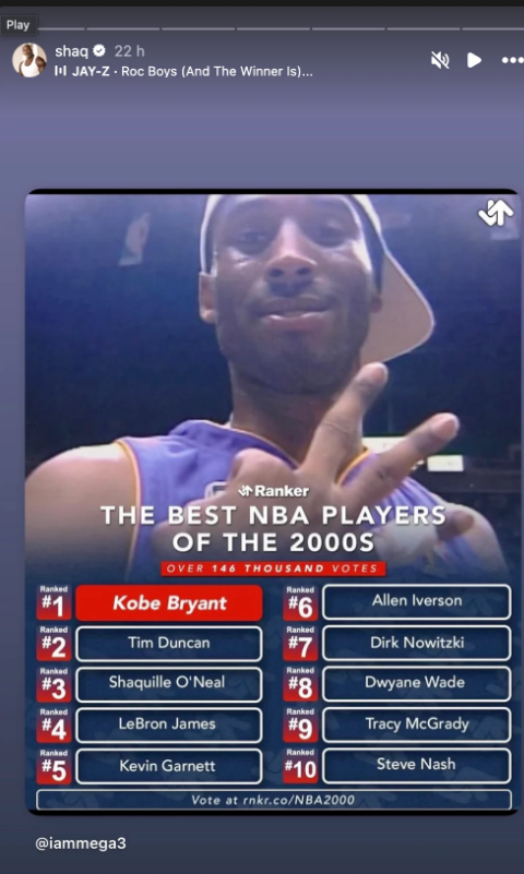 奥尼尔转发21世纪头十年球员排名:科比领跑,詹姆斯排第四